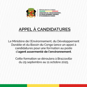 Le Ministère de l’Environnement, du Développement Durable et du Bassin du Congo lance un appel à candidatures pour une formation au poste d’agent assermenté de l’environnement.